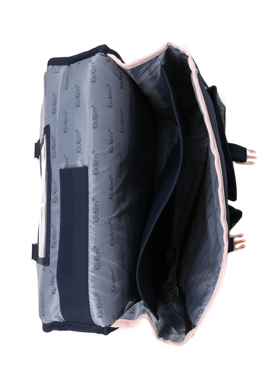 Le cartable Kickers Girl se ferme par un rabat à attaches clips, très commodes d’utilisation, masquées par des sangles à boucle métallique décoratives. Ses deux compartiments permettent de sérier les cahiers et classeurs de formats A4 et 24 x 32 cm, les livres de cours, la trousse et l’agenda. Deux poches frontales ouvertes logent à part les petits accessoires et les indispensables comme la barre de céréales pour la récréation et le paquet de mouchoirs. Les détails très utiles : sous le rabat sont aménagés un porte-emploi du temps et une poche spéciale règle.
