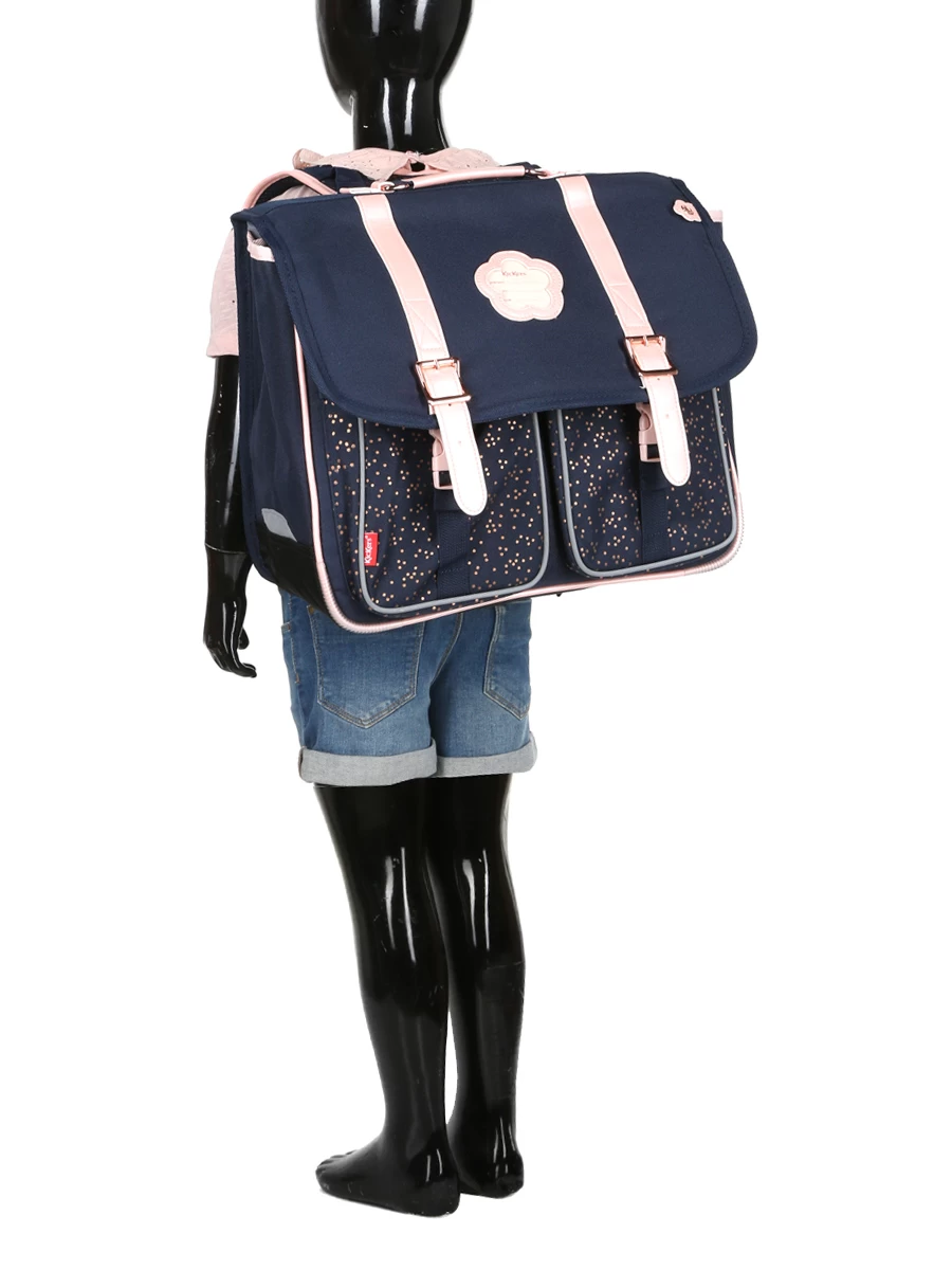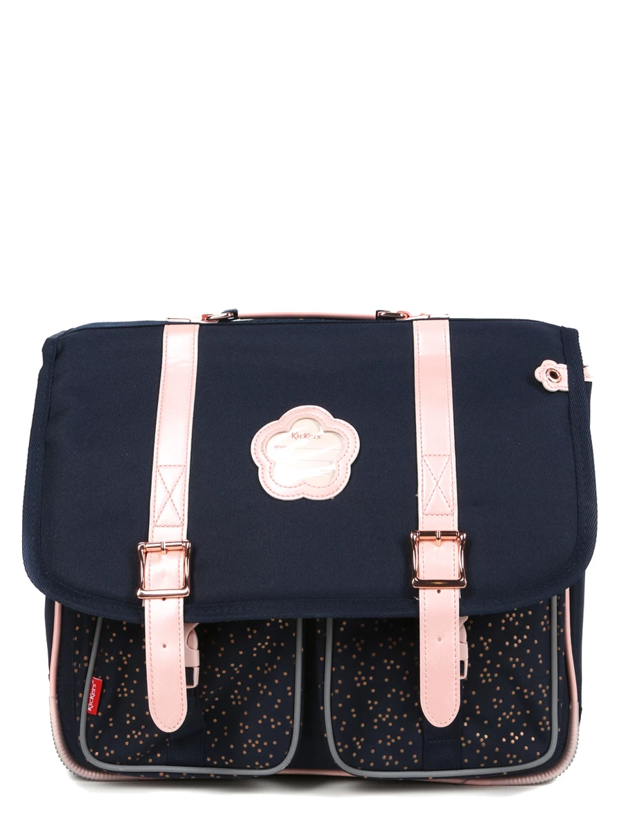 Le cartable Kickers Girl 38 cm réunit tout ce qui fait le charme rétro de la célèbre marque dans une version girly qui devrait faire des jalouses dans la cour de récréation, parmi les jeunes élèves en classes de CP, CE1 et CE2. Son revêtement bleu marine est relevé de finitions en simili-cuir rose, d’un porte-adresse en forme de fleur et de pois dorés sur les poches frontales. Bien conçu, il présente un aménagement très fonctionnel et un système de portage ergonomique. Fabriqué en polyester 900 deniers et renforcé au niveau des angles inférieures et du fond, il offre une bonne résistance aux frottements.