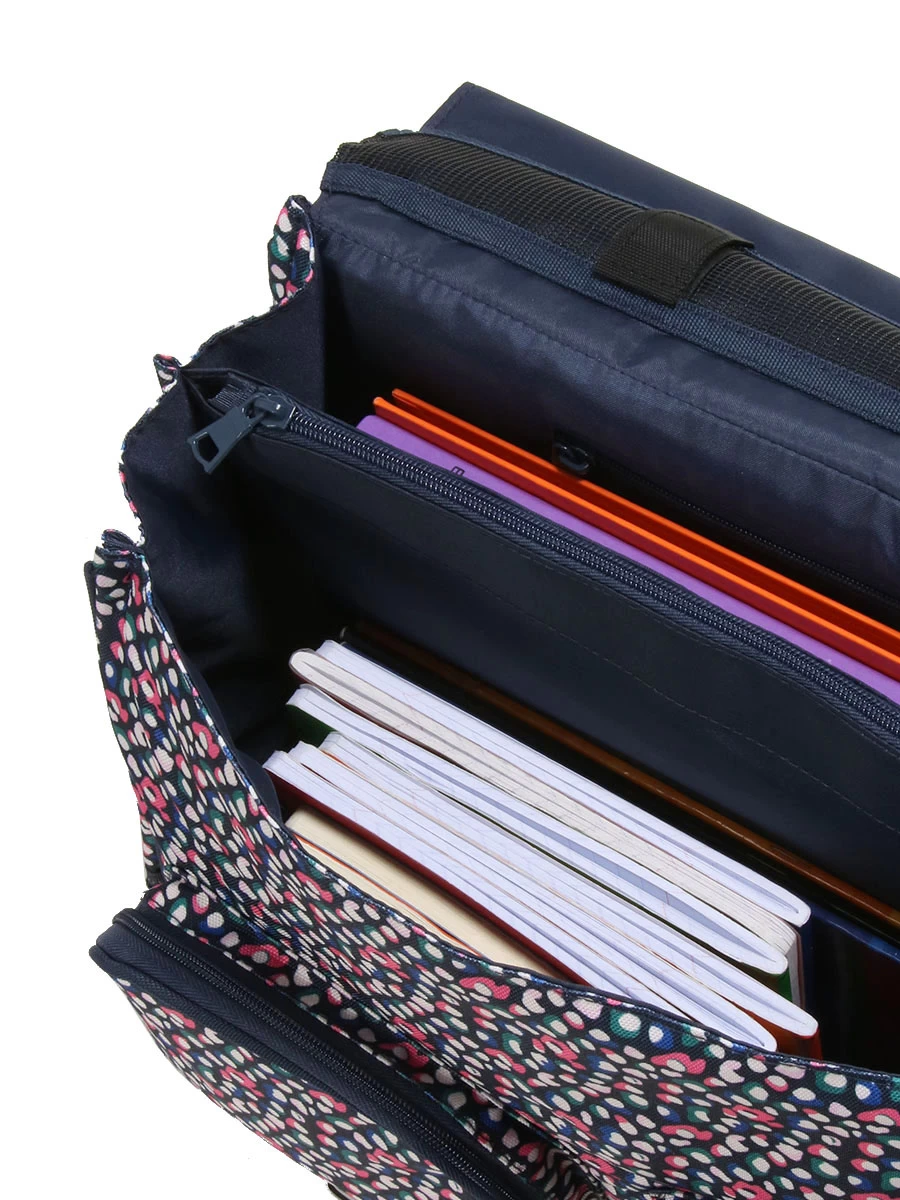 Côté rangement, le cartable filles Tann’s Sara ne lésine pas sur la fonctionnalité avec ses nombreuses poches. On en dénombre pas moins de 6 ! A l’intérieur, on trouve 2 poches zippées, une poche pour la règle et une autre pour l’emploi du temps. A l’extérieur, 2 autres poches à fermeture éclair viennent compléter le tout. Ses 2 compartiments spacieux permettent en prime de transporter aisément cahiers 24 x 32, classeurs pour feuilles A4, livres, trousse, etc.