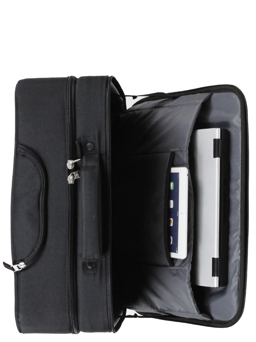 Le second compartiment offre la possibilité de ranger en toute sécurité un ordinateur portable ainsi qu’une tablette tactile dans des espaces matelassées. Il est également possible d’y laisser plusieurs dossiers / documents professionnels. A l’extérieur, on trouve 3 poches de rangement (une poche pour la poignée télescopique et 2 poches frontales). La plus grande d’entre elles offre, en addition, 3 poches de rangement (format téléphone portable).