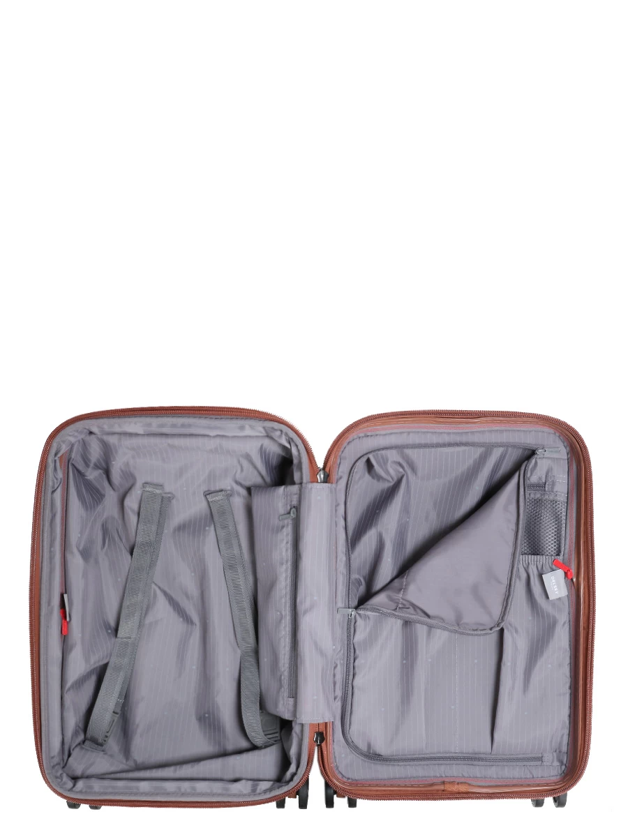 Les valises 4 roues Delsey Promenade Hard 2.0 s’ouvrent sur deux compartiments dont la doublure est amovible et lavable, afin de pouvoir nettoyer intégralement son bagage à chaque retour de voyage. D’un côté, les vêtements sont maintenus par des sangles réglables pour qu’ils ne se froissent pas et de l’autre, les objets plus encombrants comme la trousse de toilette sont retenus par un panneau souple zippé. Celui-ci est doté de deux poches ouvertes où loger des chaussures. Les petits accessoires trouvent leur place dans les deux autres poches intérieures.
