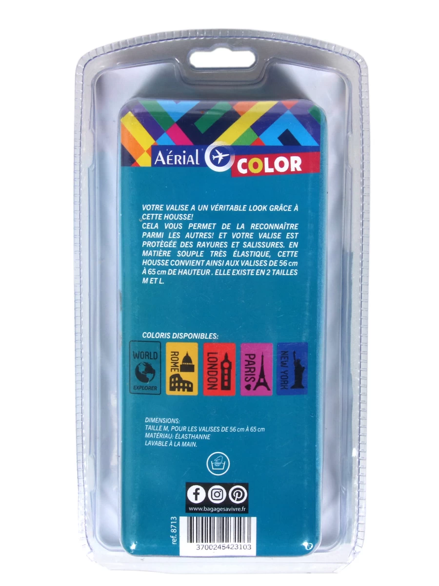 La housse de valise Aerial World – M a tout pour plaire aux voyageurs empruntant très régulièrement les compagnies aériennes ou ferroviaires. En effet, elle permet de rendre votre valise aisément identifiable, même de loin, avec son coloris plein de pep’s. Elle offre en prime une protection additionnelle contre les aléas du transport en soute (éraflures, etc.). Sa conception extensible en polyester et élasthanne permet de l’utiliser sur des valises ayant une hauteur de 56 à 65 cm maximum. Pour ne rien gâcher, elle est disponible à un prix très attractif qui ne grèvera pas le budget des vacances.