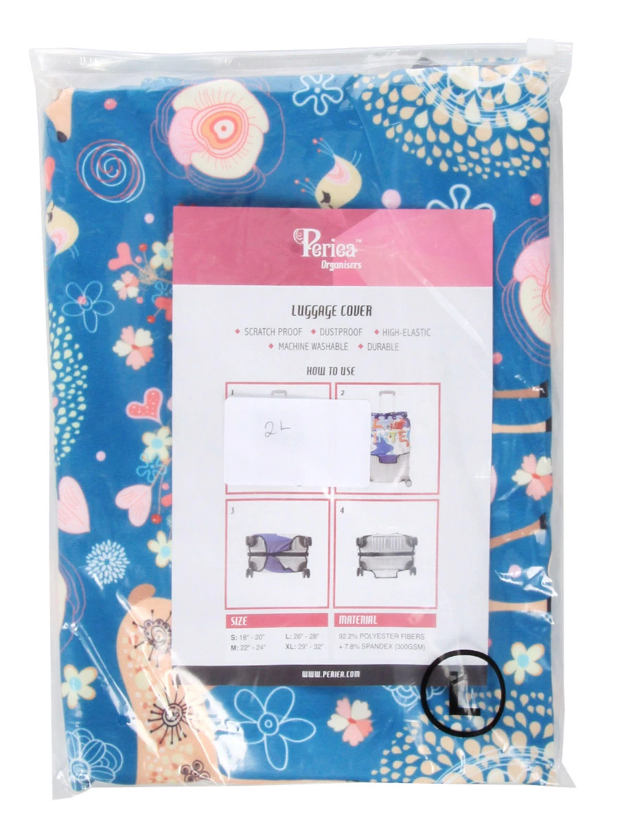 La housse de valise Periea Blue Animals L apporte une touche de fantaisie aux grandes valises avec ses doux motifs de faons et d’oiseaux entremĂŞlĂ©s de fleurs et de cĹ“urs. Pratique pour rendre son bagage plus facilement repĂ©rable, elle offre Ă©galement une protection contre les petites dĂ©gradations telles que les rayures de la coque et les salissures qui peuvent survenir pendant le roulement de la valise ou lors de son sĂ©jour en soute. Pour s’ajuster parfaitement Ă diffĂ©rents gabarits, jusqu’Ă 78 cm de hauteur, elle est fabriquĂ©e en un matĂ©riau extensible composĂ© de polyester et de spandex.