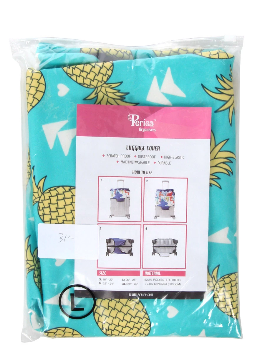 La housse de valise Periea Green with Yellow Pineapples L redonne des couleurs à votre valise avec ses motifs d’ananas jaunes sur fond vert menthe. Que ce soit pour rajeunir une valise ancienne ou personnaliser et protéger des éraflures et de la saleté votre nouvelle valise toute neuve, cette housse est un accessoire indispensable. Conçue pour recouvrir de grandes valises, elle s’adapte à plusieurs tailles jusqu’à 78 cm de hauteur grâce à sa confection en polyester et spandex qui lui confère de l’élasticité.