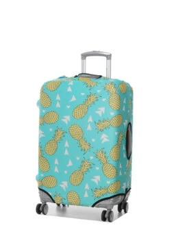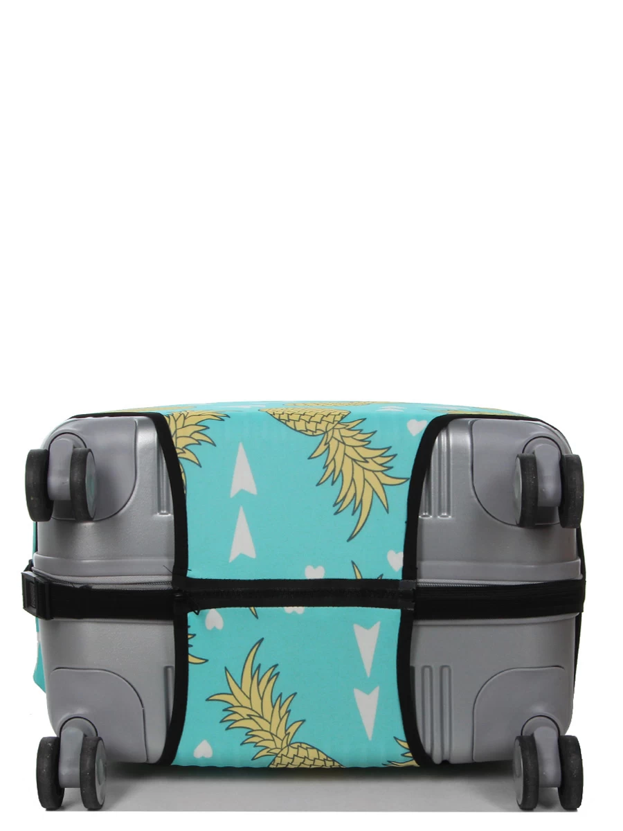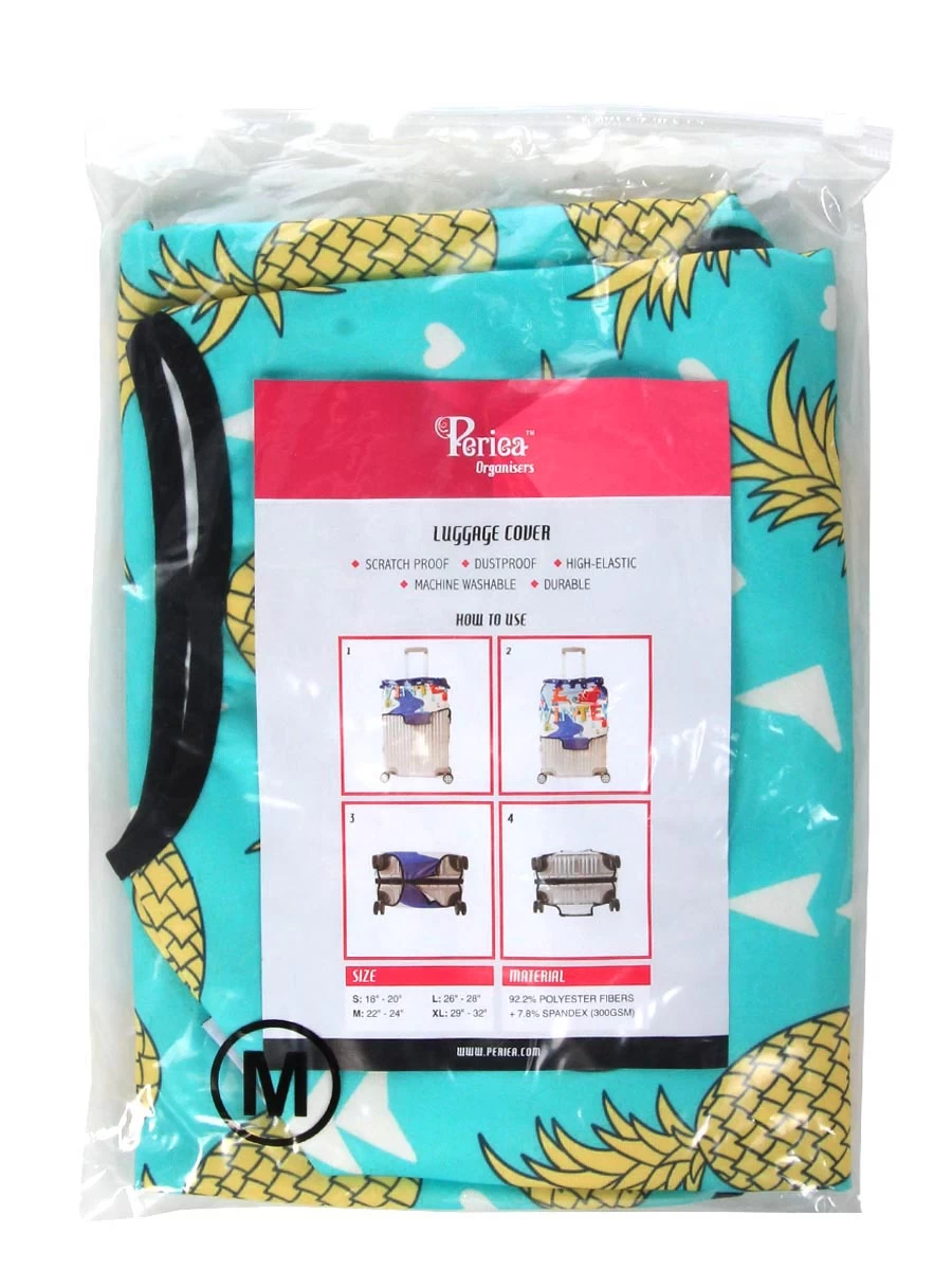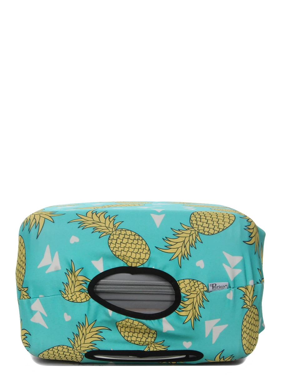 La housse de valise Periea Green with Yellow Pineapples M habille votre valise de ses amusants motifs d’ananas sur fond turquoise qui évoquent l’été. Cet imprimé plein de fraîcheur permet à votre bagage d’être rapidement repérable parmi ceux des autres voyageurs et de ne plus se tromper au moment de le récupérer par exemple sur le tapis roulant à la descente d’avion. Fabriqué en un tissu extensible à base de polyester et d’élasthanne, il s’adapte à une valise moyenne jusqu’à une hauteur de 68 cm. Ce tissu préserve la coque des éclaboussures pendant le roulement et des inévitables petites rayures qui surviennent notamment lors de la mise en soute.