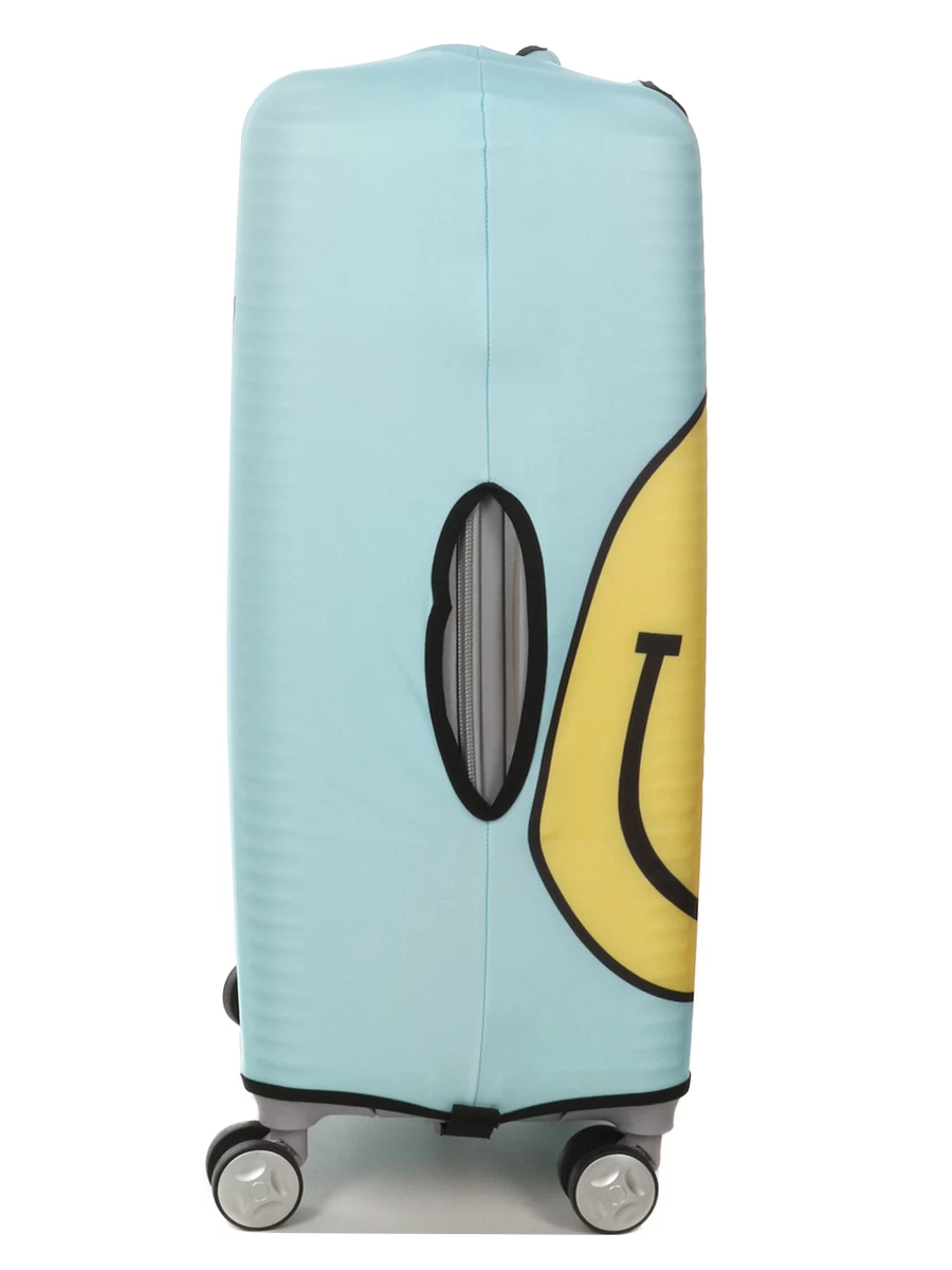Bandes élastiques et fermetures par attache et zip servent à fixer la housse Periea Smiley Face sur la valise de telle façon qu’elle ne se décale pas pendant les trajets et les diverses manutentions. La poignée télescopique et celles de portage restent accessibles grâce à des découpes pratiquées dans les parties supérieure et latérale de la housse.