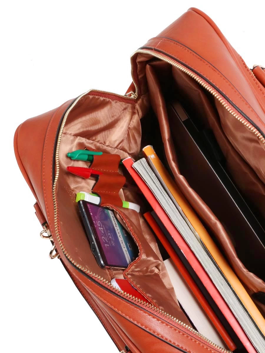 Le compartiment spacieux du pilot case Olivia Lauren Sasha peut accueillir aussi bien nombre de dossiers de travail qu’un peu de linge lors d’un déplacement professionnel. Sa poche matelassée permet de transporter en sécurité un ordinateur jusqu’à 16 pouces. Celle-ci est fixée à l’intérieur par des attaches velcro permettant de sortir facilement le matériel informatique. Une poche zippée, 2 poches ouvertes, une poche pour le téléphone et une poche zippée sont présentent pour simplifier l’organisation des effets personnels et des fournitures de bureau. A l’extérieur, une dernière poche à rabat à attache métallique vient compléter le tout.