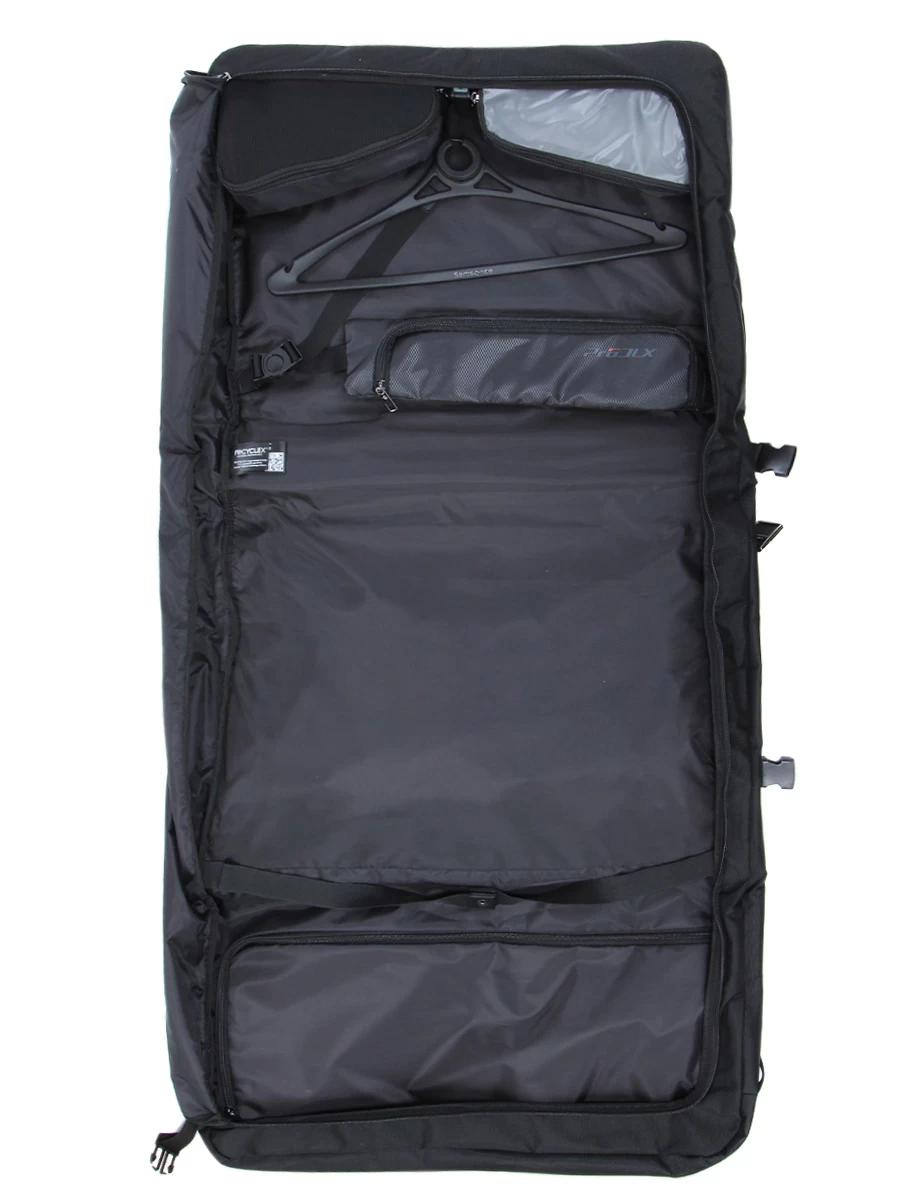 Le porte-costume Samsonite Pro DLX 6 permet aux hommes d’affaires d’honorer tous leurs rendez-vous et rĂ©unions nĂ©cessitant des dĂ©placements sans craindre de dĂ©boires vestimentaires. Un costume et trois chemises peuvent loger Ă plat dans son compartiment, placĂ©s sur le cintre et maintenus par deux sangles Ă©lastiques. Ainsi, aucun risque de les dĂ©couvrir froissĂ©s Ă l’arrivĂ©e. Pour accrocher le costume dans la penderie de la chambre d’hĂ´tel, le cintre peut se dĂ©tacher du porte-cintres. Celui-ci dispose de quatre crans et peut donc accueillir au total quatre cintres (dont un seul est fourni). Une grande poche intĂ©rieure plate peut loger le linge de corps, tandis que deux autres poches zippĂ©es sont prĂ©vues pour le nĂ©cessaire de toilette et autres petits accessoires. Simplement fixĂ©es par des scratches, ces deux dernières peuvent se dĂ©tacher et ainsi ĂŞtre utilisĂ©e de façon pratique dans la salle de bain. L’une d’elles, dotĂ©e d’une doublure impermĂ©able et d’une paroi semi-transparente, est parfaite pour loger les produits d’hygiène sans risquer des fuites de liquide. Les cravates quand Ă elles sont placĂ©es Ă part dans une poche en long dĂ©diĂ©e qui fait Ă©galement office de sangle de maintien supplĂ©mentaire pour les vĂŞtements. Une attache situĂ©e sur le haut du porte-habits et un crochet amovible permettent de le suspendre afin d’ouvrir entièrement sa fermeture à glissière et ainsi accĂ©der aisĂ©ment Ă son contenu. Enfin, deux poches frontales zippĂ©es offrent un important espace de rangement supplĂ©mentaire, parfait pour loger les documents de travail et les titres de transport par exemple.