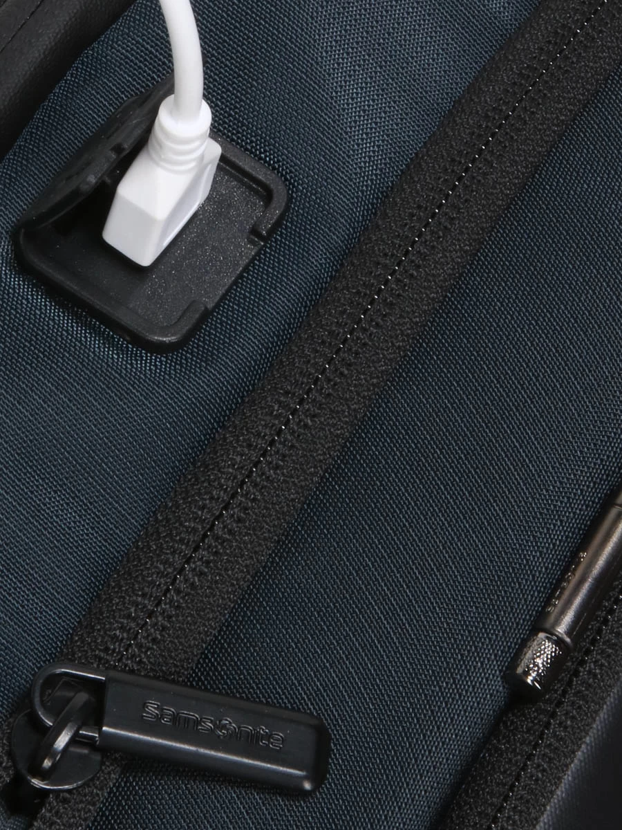Le sac business Samsonite Biz2Go comporte un compartiment multimédia à l’arrière. Celui-ci dispose d’une poche matelassée pour ordinateur jusqu’à 14.1 pouces et d’une poche tablette, moussée également. Le compartiment central peut accueillir des dossiers au format A4, qui restent maintenus bien en place grâce à la grande poche plate rembourrée prévue à cet effet. Au dessus, deux petites poches plates sont parfaites pour y glisser des clefs USB par exemple. En face, une large poche en mesh est idéale pour loger les chargeurs de l’ordinateur et de la tablette. Sur le côté, sous le câble USB, une petite poche en maille filet est prévue pour la batterie nomade (non fournie). En haut du compartiment, une petite ouverture permet de faire passer le câble dans le compartiment voisin. Celui-ci comporte deux poches moussées pour téléphone portable et une poche étroite pour y ranger quelques stylos. D’autres fournitures de bureau plus volumineuses peuvent également trouver leur place dans ce compartiment.
