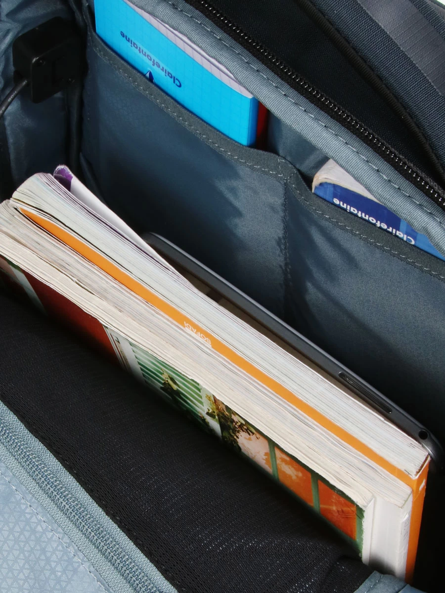 A l’extérieur, le sac ergonomique Samsonite Biz2Go possède 4 poches, dont deux frontales et deux latérales. La première poche frontale peut accueillir un livre et est équipée en son intérieur d’une poche en mesh pour accessoires divers. La seconde poche frontale possède une ouverture latérale, elle est parfaite pour glisser carte de transport et autres documents pour un accès rapide. Les deux poches latérales sont extensibles et munies de boucles élastiques pour maintenir gourde et bouteille isotherme en place pendant les déplacements.