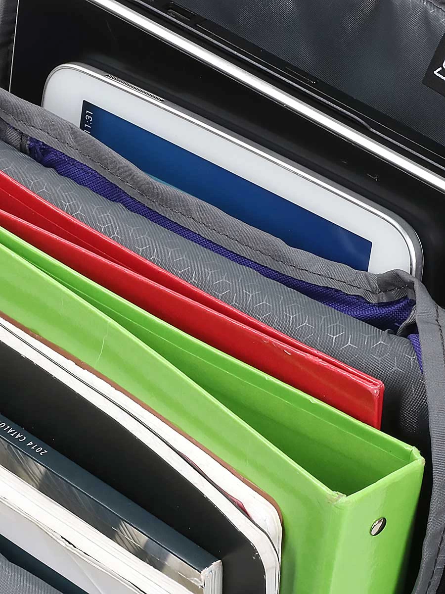 Le sac à dos ergonomique Samsonite Roader M comporte trois compartiments doublés. Le premier, situé à l’arrière et rembourré, est dédié au numérique. Il peut accueillir un ordinateur jusqu’à 15.6 pouces et dispose d’une poche pour tablette. Le second, au milieu, est le plus grand, il peut contenir nombre de dossiers au format A4 maintenus à la verticale dans sa grande poche plate. Une veste peut également trouver sa place à l’intérieur. le troisième compartiment est pensé pour les accessoires. Il est doté d’un mousqueton pour les clefs, d’un passant pour stylo et de deux poches plates conçues pour la batterie nomade (non incluse) et le téléphone avec sa coque. Il peut en outre loger des livres.