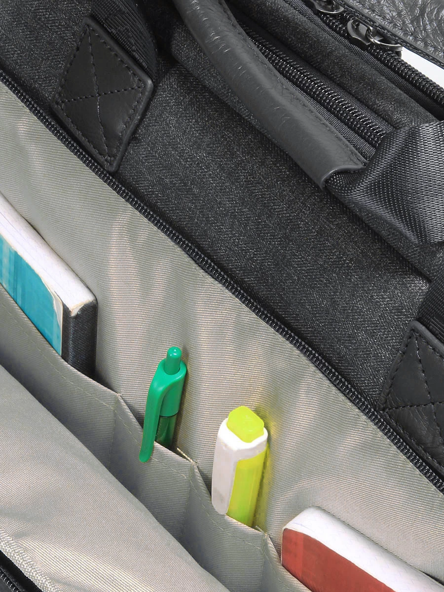 La sacoche Katana Business Casual dispose d’un compartiment avant idĂ©al pour un classeur, des pochettes, des mĂ©mos, des revues techniques, etc. Sa grande poche zippĂ©e permet de ranger Ă part diverses fournitures de bureau. Son compartiment arrière, intĂ©gralement matelassĂ©, est quant Ă lui tout indiquĂ© pour une tablette ou un ordinateur jusqu’Ă 15 pouces. Sa poche frontale spacieuse permet de sĂ©rier efficacement les effets personnels grâce Ă la prĂ©sence de 2 poches plates et de 2 passants pour stylos. Pour les ajouts de dernière minute, on peut opter pour sa poche arrière zippĂ©e.