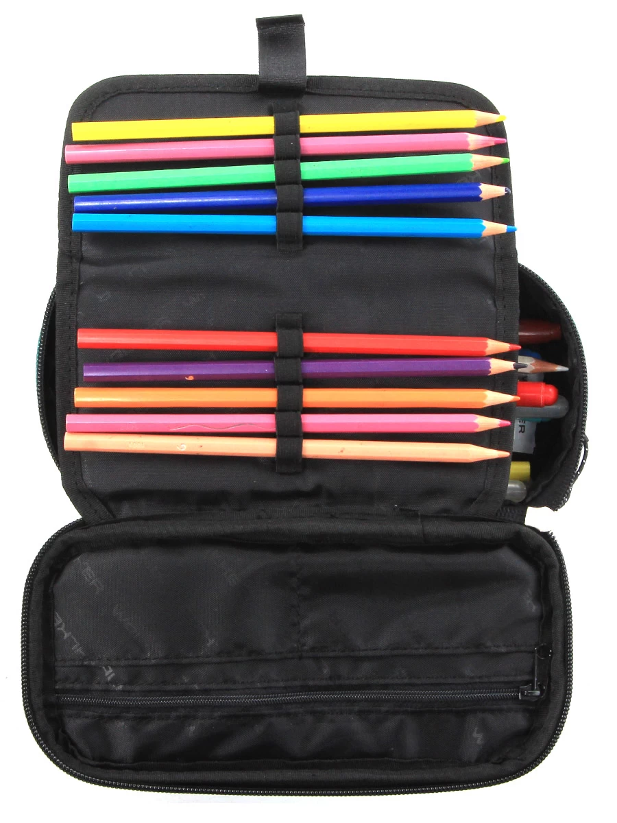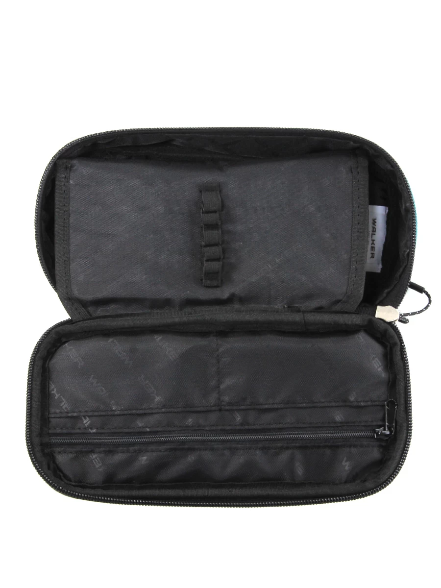 Le plumier Walker Alpha s’ouvre par une fermeture à glissière sur un compartiment dans lequel logent par exemple le nécessaire d’écriture : stylos bille et stylos plume, crayon de bois, surligneur, etc. Crayons de couleur ou stylos feutres trouvent leur place sur le plateau doté de passants qui se plie en deux et se fixe par deux pattes à scratch. Deux petites poches ouvertes situées sous le couvercle accueillent une gomme, un taille-crayon et d’autres petits accessoires. La paire de ciseaux, une petite règle et un compas peuvent être rangés dans la poche intérieure zippée.